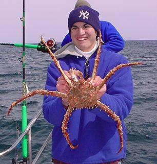 Unexplained Phenomena: What was in the air this summer that made Ed Jeter show up a week before the Ultra expecting to be sailing to far off places the next day? --- Was it the same thing that made John Baron show up for the marathon a day early only to take a drubbing from Jim Feeney as he drove home, tail between his legs? --- Where was John when Jim missed the bachelor party trip? Wish you had been there Jim! --- It's okay, so you missed the best trip of the year. There will be others. Right, Lance Burleigh? Nothing like being so late that you can't wave to your friends as they go under the bridge. --- The same thing happened to Eric Abrams and his father a couple of years ago. This year Eric made the boat but decided not to get into the boat pool. Captain Ian sponsored him, Eric landed the largest fish and the money went to Ian. A 49 pounder! Who knew? --- Actually, it takes much time on the ocean and many anchors left on the bottom to become a successful captain, Ian. "It costs a lot for an education!" (Dan Libby, circa 1990) --- Who would have the heart to call Dennis, that most excellent singer/fisherman, the Tolland Tangler? --- "Thank you, can you hurl on my right shoulder as well?" a semi-quote from Richie Hajduchik after he got assaulted on both sides during a late fall marathon trip. --- Actually, who could be more understanding than Stan Dlugoborski (CT) when I forget to mark his fish and he goes home with just a couple - and the simple truth that he was right? I owe you one, Stan. I won't forget! --- Only one trip for Greg Veprek (MA) on the Bunny Clark last season? --- Observe, if you will, the cat like reactions of young Allyson Fuehrer as she leaps out of the path of an approaching wave only to let her father feel the full force of that cold, wet behemoth! Did I spell your name correctly this time? --- And Jim "Bunky" Bowden (NH) has never been sea sick before? Right! --- Nice of you, Keith Borkowski (CT), to allow those neophytes (Dave Lybass (CT) & Don Gilbert (CT)) to fish the pants off you! Speaking of fishing prowess, where is that cover fish? --- Hey, Eddie Jeter, one other thing. Thanks for the new gloves! Any time you need to borrow any, you know I will be there for you! --- Don't worry Norm Denoyers (NY); many anglers lose all their line on the way out to the fishing grounds. --- James (shown above with his spider crab)! How could you let father Ted Fowler beat you this time? What do they call a guy who consistently loses most of the fish that he hooks? --- Adam Labelle (ME). One fish in two trips? You are just going to have to break down and ask Asheley Simpson (ME) about the fishing techniques she is employing! --- Carlos DaSilva (MA)! What do you tell fifteen Brazilians who all become sea sick on a moderately calm day near the end of July? --- Don Calsyn (MA). Did you hook a dolphin or was it that boat that just went by? --- That was a nice deflection, Jack Judge (CT). Lucky for you that you had your oilskins on! --- And Dave Cutler (ME); is that a dolphin following us or is it the anchor dragging behind the boat? --- There is always the next World Series. After all, Jim Maggiore (NH), you can't win them all! --- And then there is Rod Wood (PA), that most capable of fishermen. You are just going to have to pay a little more attention this season. A hook in the hand may not prevent you from fishing but it does slow you down! Could you swing that jig just a couple more feet to the left, Tom Miller? --- Dave MacDonald (MA) sure seemed like he did better this season. Of course, it's easy to look good when you're not fishing next to a bow god like Bruce Almighty!