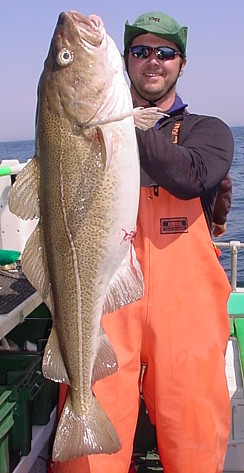 [The shot on the left was taken by Captain Ian Keniston on the full day trip of June 14, 2008. The angler is Jay O'Connor (ME) holding his 38.5 pound Maine state trophy cod. This was the largest cod that was caught and released alive during the 2008 cod possession season on the Bunny Clark. A quick weigh-in, a quick picture (one) and the fish was dropped over the side where it swam quickly to bottom.]