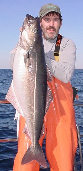 "It was big." This is a quote from Captain Ian Keniston who had been working the deck for Captain Tim (me) on a marathon trip in October. Jon Tesnakis (NY) had a big fish on but, as is typical of Jon, he didn't want to get everyone excited (call for the gaff) before he saw exactly what he had on his line. When he did, he also realized that there was a big blue shark right behind the tail of this big pollock he had on the line. Ian got a look at the fish but nowhere near in time to rescue Jon's fish from the jaws of this hungry shark. I got his quote after I asked him how big the pollock actually was, as Jon was acting hugely disappointed. Knowing that Ian is incapable of prevarication and also knowing that overstatement is not in his nature, I would say that the pollock was probably over 30 pounds or one of the biggest of the year - had it been weighed!