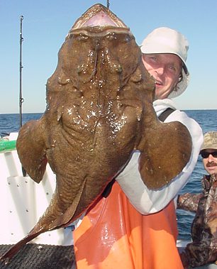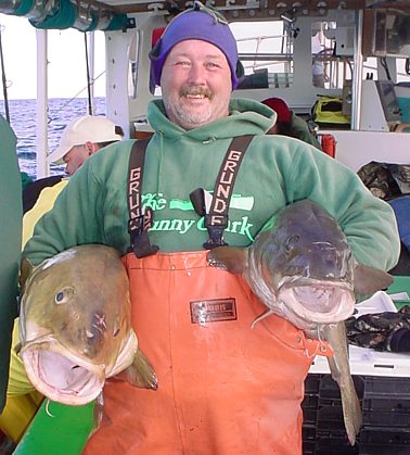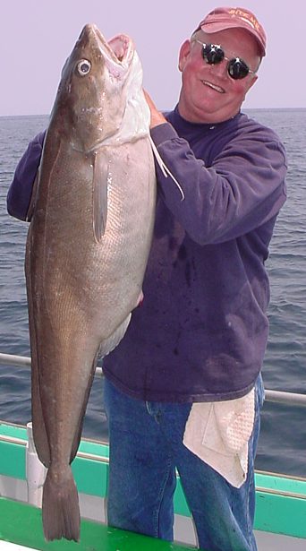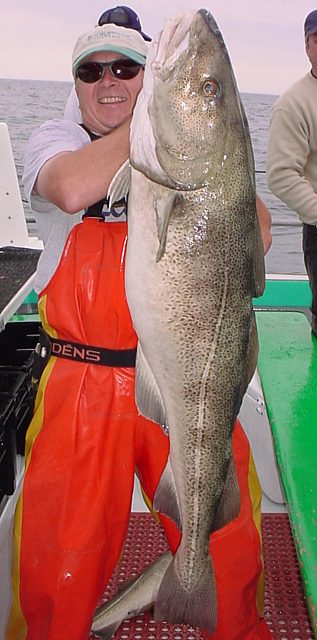 [The image on the left is a shot of Tom Hadley (NH) holding his 47 pound cod. The picture was taken in July 2004 on a full day trip. This is the largest cod that Tom has ever caught. During the 2003 season, Tom caught his largest wolffish, a Maine state trophy weighing 31 pounds (the largest wolffish caught that season and the third largest wolffish that has ever been landed on the Bunny Clark), and his largest white hake, another Maine state trophy of 34 pounds. ]