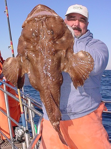 [The picture on the left shows Chris Porter holding his 20.75 pound Maine state trophy monkfish caught on an offshore marathon trip the last day of October 2008. ]