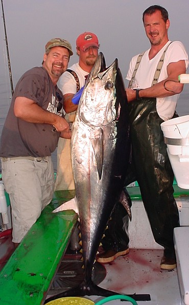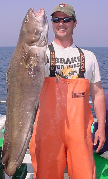 Most Unusual Catch: Arnie Buza (NJ), an excellent fisherman who has had a few blue sharks "by the balls" [his quote] over the years, hooked on to a bluefin tuna while jigging for cod in early October (on the second stop of the morning). He broke the fish off before I had a chance to see what was going on because he "didn't want a blue shark to take all his line." Much later that same trip, Arnie took a cast off the bow only to have another bluefin take his jig and go screaming aft with his line. The surface tension was so great on the line that the line parted again, this time without Arnie's help. Fifteen minutes later on this same drift, Iggy Goula (PA - Little Fred's buddy) hooked into his broken line and got his jig back! Apparently, the tuna had shaken the jig out of its mouth shortly after Arnie's line had broken off and we were just lucky to be drifting in the right direction!