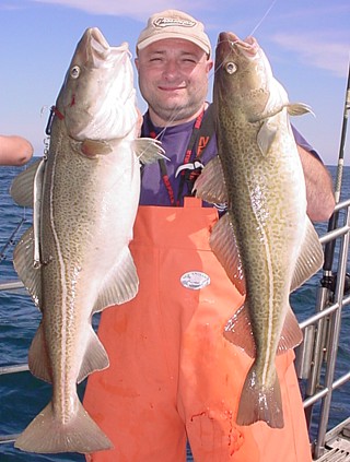 [Left; a digital image of Fred Kunz holding his double keeper catch of cod caught on the August 28, 2008 marathon trip. The larger cod weighs 17.75 pounds while the other weighs 11.5 pounds.]