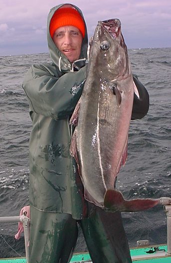 Steve Selmer (NH) holds a still lively 28 pound Maine state trophy pollock caught on the October 22, 2004 marathon trip. This was a particularly windy day where oilskins and a strong stomach were required. Steve's pollock is the largest he has ever caught and a tie with Dick Lyle (NY) for the second largest pollock of the Bunny Clark fishing season. Steve is an excellent angler who usually fishes with his father, Ken, on Bunny Clark marathon trips.