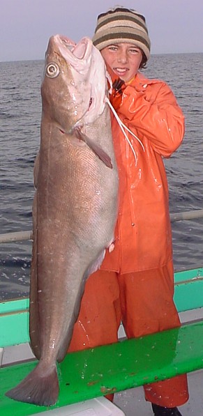 [The digital image on the right shows thirteen year old Finn Swenson holding the largest groundfish of his life, a 37 pound Maine state trophy white hake which he caught during the Summer of the 2009 Bunny Clark fishing season. Had not Reece's hake been caught in the 2008 season, Finn's fish would have been a contender for the Maine (male) Junior Angler State Record.]