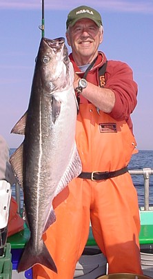 Exceptional Good Luck: Jack Henke (NY) dropped his jig to bottom while on a marathon trip. Leaving his rod on a bench unattended, he walked away to do something. Shortly, a big hake grabbed the jig, pulled the rod off the bench where it caught briefly on the life rail and then shot overboard. Jack looked pale. I was concerned for Jack's feelings and for the loss of my equipment to the tune of $500.00. It must have been five or ten minutes later when Jay O'Connor (ME), fishing on the opposite corner of the stern from Jack, announced that he had caught a line! Ian Keniston and I assumed correctly that it was Jack's line with rod attached! Both of us worked with Jay, got the rod back to the surface and in the boat. We then pulled in Jack Henke's 32 pound Maine state trophy white hake!