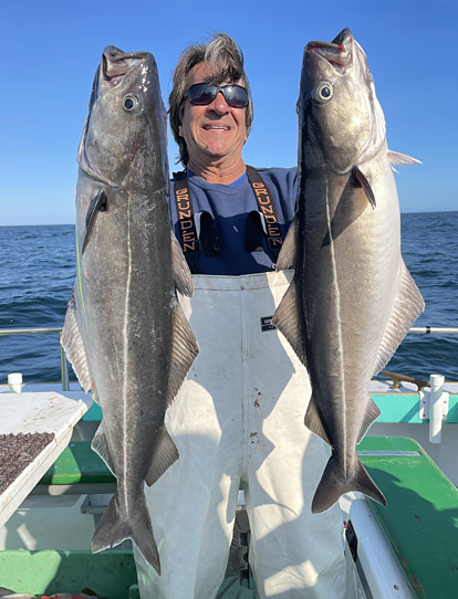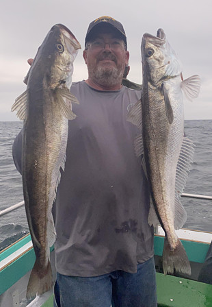[The digital image on the left is a shot aboard the Bunny Clark showing Jim Koplar (CT) holding his pollock double (both fish caught on the same line at the same time) that he caught on a marathon trip with me in October of last year. The pollock weighed 17.5 pounds and 12 pounds. This tied for the sixth largest double last season. ]