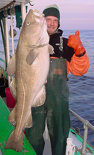 We have a rich history of catching big cusk, probably due to my penchant for scouting out new areas. For a time, I chased after big cusk looking for world records. We enjoyed variable success in this department. The Bunny Clark's first world record cusk was a 29 pounder caught by Ross French (NY) in 1987 that broke the existing world record of 24 pounds 9 ounces caught by a guy off the coast of Norway in 1983. Ross' cusk's registered weight was 26.66 pounds. It was beaten only seven days later by a cusk caught off Massachusetts that officially weighed 28 pounds 15 ounces! We captured the world record again in 1988 when Neil Morrill (VT) caught a 31 pounder. We were drifting off a deep peak on the way back from fishing Tantas west of the Portland Lightship. It was the last fish in the boat. So I steamed home, got the fish weighed immediately and came up with the official registered weight of 30 pounds 1 ounce, the new official IGFA all tackle world record. Eight days later, it was beaten again, by a cusk caught off the coast of Norway that officially weighed 32 pounds 13 ounces! It wasn't until October 11, 2002 that we had the chance to beat it again with a 36 pound cusk caught by Kenton Geer (NH/HI). At the time, the all tackle world record was just over 34 pounds. Kenton's fish was disqualified because he caught the cusk with a jig that had a tube hook on the jig itself and a cod fly/hook in a dropper loop above the jig. It came under the title of "gang hooking", a no no as it concerns the IGFA. Today's existing all tackle world record cusk was caught in July of 2008, again, off the coast of Norway. The present world record weight is 37 pounds 14 ounces, a hell of a cusk. The table below shows the top twelve cusk caught on the Bunny Clark over the years: