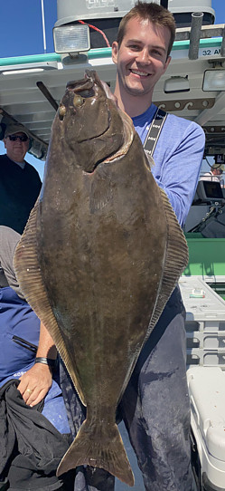 [The digital image on the left was taken by Captain Ian Keniston. The picture is a shot of Greg Mallot (NY) holding up the Bunny Clark's first legal halibut of the 2024 season. Greg caught this fish just before mid June. Only three legal halibut were caught last season, one of our slower seasons in the last fifteen years. ]