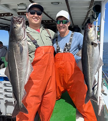 [The digital image on the left is a shot I took of Chao "Zorro" Zou (MA - left) holding his 18 pound pollock and Scott Steinback (MA - right) holding his 13 pound pollock. Both fish are the largest of that species either has ever caught. The picture was taken during a late June offshore trip. Both are bio-economists who work in fishery management with the National Oceanic and Atmospheric Administration. I have worked directly or indirectly with them setting New England saltwater recreational groundfishing regulations for several years. ]