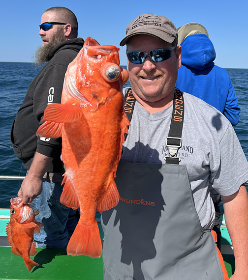 [The picture on the right is a shot of Mark Girard holding his 8 pound Maine state trophy haddock that he caught on a marathon trip with me May 2, 2024. He caught this fish as a double with another haddock that looked bigger that dropped off the hook before he was able to swing both over the rail. In hindsight, I should have been beside him with a gaff. Had I been, we would have recorded the largest haddock double that I have ever seen. I can tell you that I did. But I am unable to qualify that statement. I believe that this is Mark's biggest haddock. He caught three haddock, all weighing 8 pounds, last season!]