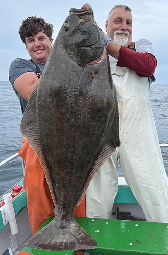 [ Dave Burton, shown right (in white oil gear), can be seen, along with Kai Rosenberg, who was the deck hand that day, holding the Bunny Clark's largest halibut of the 2024 fishing season. This was also the largest halibut that Dave has ever caught and the third good sized halibut that he has caught in New England waters. He also caught a 77.5 pound halibut with me during an offshore trip on April 23, 2023. Unfortunately, on that trip, he had to release this halibut back to the ocean alive as we already had boated an 150 pound halibut earlier on that same trip!]