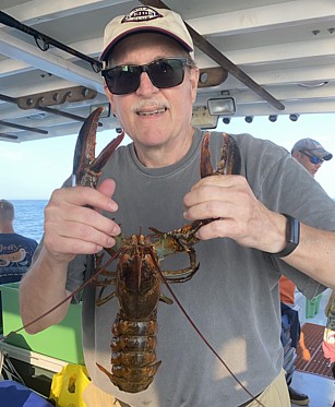 [The digital image on the left shows Rick Davis (ME) holding a 1.5 pound female berried (egg bearing - eggs located under the tail) lobster that he caught during an afternoon trip August 1, 2024. We couldn't keep this lobster anyway, by law. But if you were a lobsterman, you couldn't keep it either as any berried lobster can't be in your possession. Berried lobsters have to have a "v" put in the tail and released, which this lobster was. The image was taken by Captain Ian Keniston. ]