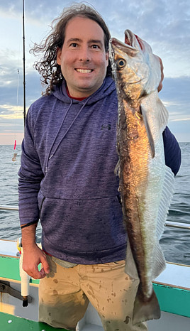 [The digital image on the right is a shot of Stephane Cloutier (MA) taken just before sunrise during an early September marathon trip. He is holding his 3.5 pound Maine state trophy whiting, almost the first fish in the boat that day. This was his largest whiting ever. This fish also tied for the Bunny Clark's third largest whiting of the 2024 fishing season. ]