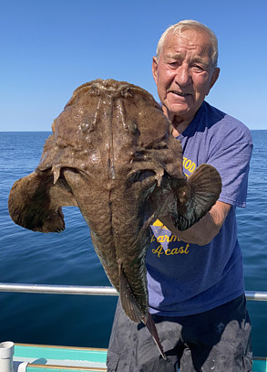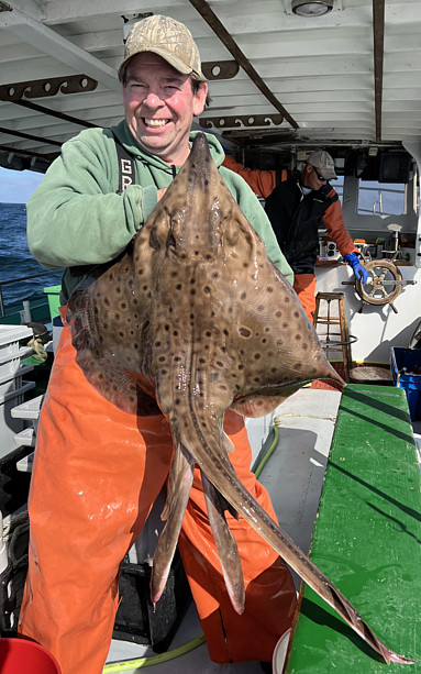 [In the digital image, left, Erik Grove (ME) can be seen holding the Bunny Clark's largest barndoor skate caught during the 2024 fishing season. He was fishing with me on a fall marathon trip at the time. This skate was the last fish caught that day and also won him the boat pool for the largest fish of the trip. The fish was weighed, a quick picture taken and then released back to the ocean alive. Barndoor skates are still listed on the international endangered species list and can't be retained. ]