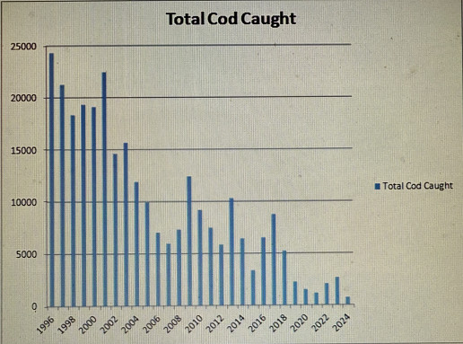 Part of the reason that we saw so many haddock, I believe, was that the commercial quota of haddock available was dropped by 85%. But we also had colder water than we did in March and April the previous year. The result was that even when the commercial boats could get them, they weren't there. When they could get them the quota was reduced too far to make it profitable to go after them. The 2023 season saw just the opposite. Those extra haddock were available in the commercial quota and the haddock showed up earlier and were available for commercial harvest. Those fish had already gone to market by the time we could chase after them. Not so last season.