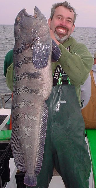 Don Johnson (MA) showing off with his 28 pound Maine state trophy wolffish caught on the June 22, 2004 marathon trip aboard the Bunny Clark. This was the largest wolffish of the 2004 Bunny Clark fishing season and his largest wolffish ever. An interesting aside, I had to gaff this fish twice to land it. After the first gaff job, I almost had it over the rail when it dropped back into the water! Had Don not been quick and released his drag, this fish might have broken off the line at the surface and taken off before I could gaff it again! Just another reason why I love Don so much!