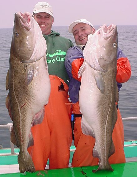 One of the greatest pictures of the summer, this shot shows Jim Feeney with a bad back (MA), shown left, holding his 57 pound Maine state trophy cod while Fred Kunz (NH) struggles to hold his 48 pound Maine state trophy cod. Jim's big cod is the largest cod that he has ever caught and I'm damn glad it was caught with me. Why he hasn't caught a larger cod before this is beyond me! Both fish were caught on the June 22, 2004 marathon trip.