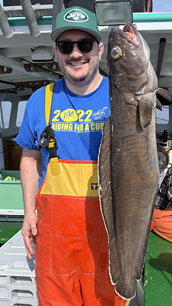 Other Angler Highlights: Mark Peterson (NY) landed a 13.5 pound white hake. It was his biggest fish. But he would have had a bigger fish had I gaffed his big pollock instead of trying to lift the fish out of the water by the fly! Normally, pollock of that size float for a few seconds. This one did not. It swam straight to bottom! Lucas Quigel (PA) caught a 17 pound pollock, his biggest fish. Jason Ridolfi (NY) boated a 12.5 pound white hake and the trip's only wolffish of the trip, weighing in at 14.5 pounds. Joe Jenks (MA) caught a 17 pound white hake. His biggest pollock weighed 14 pounds. Russ Jarvis (MA) landed a 9 pound pollock, his best fish. He also caught the most haddock of any angler today with a total count of four. Jim Jarvis, Jr. (MA) caught a 17 pound pollock and a 14 pound pollock, his two biggest fish. Jim Jarvis, Sr. (MA) landed a 12 pound pollock. Travis Carpenter's (ME) biggest fish looked like a 10 pound pollock. I didn't weigh this fish. He caught quite a few doubles. Lane Winney (NY) caught our largest cusk of the trip, a Maine state trophy of 12.5 pounds. Liam Jenks (MA) fought a leg wire from a dragger that lost gear trying to go over a piece of structure (I assume). It looked for all the world like the fight some of our previous halibut have given us before reaching the surface. How he got it off the bottom without breaking his jig off is a mystery to me! Liam caught a lot of pollock today. And Pete Lussier (NY) didn't over-sleep this morning!