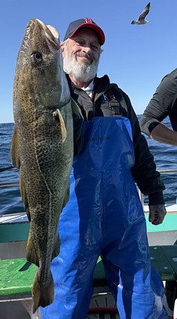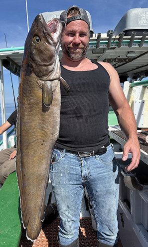 Seth Daniels (CT) won the boat pool for the largest fish with the largest fish, a 24.75 pound white hake. This is the largest hake that Seth has ever caught. I took a picture of Seth with his big hake. This digital image appears on the left. Seth also won the boat pool for the third largest fish with the third largest fish, a 23 pound white hake. He also caught a 15 pound white hake and the largest cod at 7 pounds. His keeper haddock count was five. I also took a picture of Seth holding his cod. This image appears on the right in this missive. Stephane Cloutier (MA) won the boat pool for the second largest fish with the second largest fish, a 24.25 pound white hake. His second largest fish was a 17.5 pound white hake.