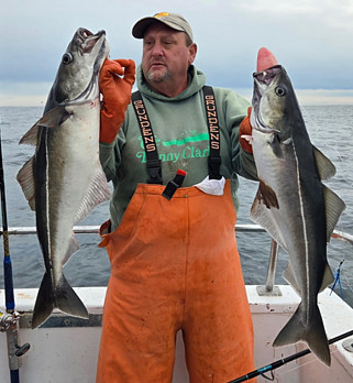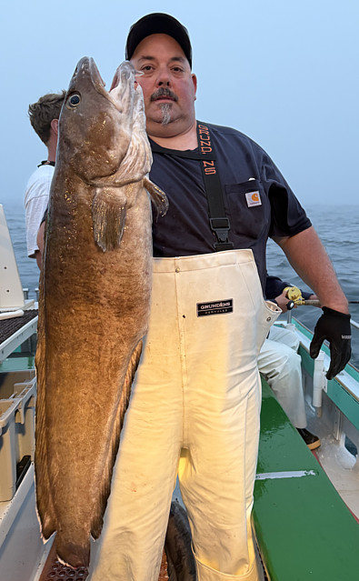 Tom Miller (NH) won the boat pool for the largest fish with the largest fish, a 32.5 pound Maine state trophy white hake. He also won the boat pool for the second largest fish with the second largest fish, a 30 pound Maine state trophy white hake. These two fish were caught as a double, both fish caught on the same line at the same time. This is the Bunny Clark's largest double of the 2025 fishing season and the largest double that has been caught on the Bunny Clark since Lewis Hazelwood (MA) landed a double that included a 40 pound Maine state trophy white hake and a 30.5 pound Maine state trophy white hake on July 9, 2019! Lewis' double might be the largest double that the Bunny Clark has ever seen. I took a picture of Tom and Danny D. holding Tom's two hake. This digital image appears on the left. Tom caught other fish today but nothing of note. He stopped fishing when it became too difficult to continue fishing on the bow. It's funny that I had my two best fishermen aboard today where I can say that I had an influence on their fishing abilities. But it was a guy under the tutelage of Phil Easteman (Eastman's Docks Fishing Fleet, Seabrook, NH) who got all the accolades.