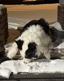 The routine continued this evening as Gill and I completed a three mile walk in an hour and eight minutes. Pretty good for an unleashed border collie of almost thirteen years of age who is sniffing and marking the whole way. He is getting lame in the hind legs, of which Deb has special treats that are supposed combat that to a certain degree. Three times I noticed he was missing from my side or from behind me. Three times I went back to find him laying in the snow, just looking at me. Three times I managed to get him moving again. An hour after we got back, it was hard to get him off the floor. He had been out like a light for over a half hour. So I think we will go back to a two mile walk for a while; see if we can move back up to more miles later. He does seem to like the walk and is always eager to go when I ask him. Of course, I'm always eager to run ten miles until I realize the body doesn't work like it used to. It's amazing to think that fifty years ago running ten miles at a 5:00 minute pace was so easy. Or maybe I think it easy now, looking back! The digital image on the left is a shot of Gill eating snow on the Barnacle Billy's dock while I took pictures of the Christmas lights on the Perkins Cove footbridge. This was part of our walking route tonight.