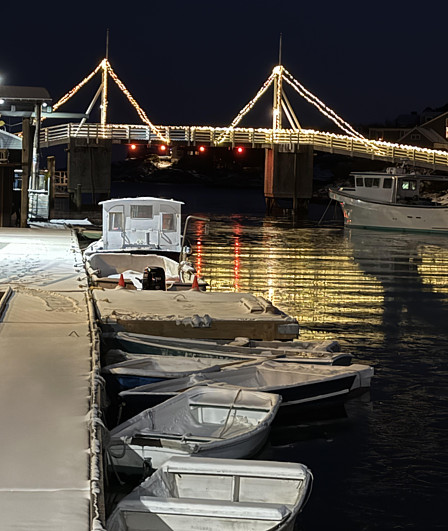 I took Gill for another walk after watching a bit of the Patriots game. I like to go after dark as there is usually no person on the Marginal Way. Actually, we only walked the southern, less slippery, portion of the Marginal, spending most of our 2.2 mile walk on the road or on the land between summer houses. We did walk through the Cove and over the Perkins Cove footbridge to continue walking over at the other side of the Cove and down shore road. There were no cars so it was a good night to walk there. Normally, it isn't. I never walk there with the dog in the summer, even with a leash. I took a picture of Gill on the footbridge. The Christmas lights are all still there. This digital image is below.