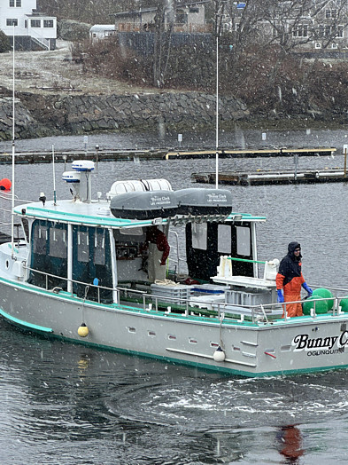 The rest of the cruise to Perkins Cove was uneventful. It snowed the whole way down the river and all the way to Perkins Cove. I had to rely on the two radars that I keep as well as the track plotter to keep me on course. But there wasn't much wind. And, because the wind was out of the southeast, we had it on our stern quarter, making it an easier than normal run. The Barnacle Billy's float was not ready yet. But the harbormaster had given me permission to put the Bunny Clark on the town dock overnight.