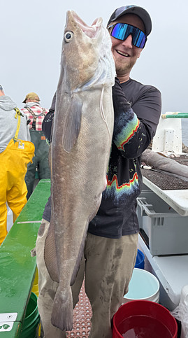 Other Angler Highlights: Mark Peterson (NY) landed a 13.5 pound white hake. It was his biggest fish. But he would have had a bigger fish had I gaffed his big pollock instead of trying to lift the fish out of the water by the fly! Normally, pollock of that size float for a few seconds. This one did not. It swam straight to bottom! Lucas Quigel (PA) caught a 17 pound pollock, his biggest fish. Jason Ridolfi (NY) boated a 12.5 pound white hake and the trip's only wolffish of the trip, weighing in at 14.5 pounds. Joe Jenks (MA) caught a 17 pound white hake. His biggest pollock weighed 14 pounds. Russ Jarvis (MA) landed a 9 pound pollock, his best fish. He also caught the most haddock of any angler today with a total count of four. Jim Jarvis, Jr. (MA) caught a 17 pound pollock and a 14 pound pollock, his two biggest fish. Jim Jarvis, Sr. (MA) landed a 12 pound pollock. Travis Carpenter's (ME) biggest fish looked like a 10 pound pollock. I didn't weigh this fish. He caught quite a few doubles. Lane Winney (NY) caught our largest cusk of the trip, a Maine state trophy of 12.5 pounds. Liam Jenks (MA) fought a leg wire from a dragger that lost gear trying to go over a piece of structure (I assume). It looked for all the world like the fight some of our previous halibut have given us before reaching the surface. How he got it off the bottom without breaking his jig off is a mystery to me! Liam caught a lot of pollock today. And Pete Lussier (NY) didn't over-sleep this morning!