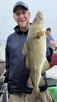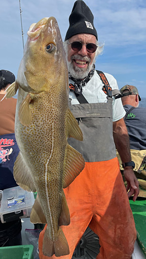 Seth Daniels (CT) won the boat pool for the largest fish with the largest fish, a 24.75 pound white hake. This is the largest hake that Seth has ever caught. I took a picture of Seth with his big hake. This digital image appears on the left. Seth also won the boat pool for the third largest fish with the third largest fish, a 23 pound white hake. He also caught a 15 pound white hake and the largest cod at 7 pounds. His keeper haddock count was five. I also took a picture of Seth holding his cod. This image appears on the right in this missive. Stephane Cloutier (MA) won the boat pool for the second largest fish with the second largest fish, a 24.25 pound white hake. His second largest fish was a 17.5 pound white hake.
