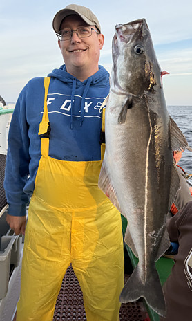 Other Angler Highlights: Paul Killmyer (ME) landed a 10 pound pollock and a 13.5 pound pollock. Kevin Viel (NH) might have caught a pollock over 10 pounds but the only one I weighed came out at 9.5 pounds. Buzz Leonard (ME) caught his first ever Maine state trophy cusk today. It weighed 12.5 pounds. It looked and felt bigger than that when I gaffed it. Some of Buzz's other fish included a double with an 11.25 pound pollock and an 11.25 cod, a 12.5 pound pollock and a 15 pound pollock. Kevin White (ME) landed a 10 pound pollock and two other pollock I didn't weigh that looked to be the same or a bit bigger. Chris Sullivan (VT) landed a double that included an 11.5 pound pollock and a 14 pound pollock. Darlene Chin (NH/FL) landed a double that included a 13 pound pollock and an 11.75 pound pollock. A good time was had by at least two thirds of the anglers aboard!