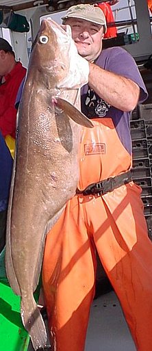 [The image on the left is a shot of Arnie Buza (NJ) holding his 49 pound cod near the stern of the Bunny Clark during a fall offshore marathon fishing trip.]