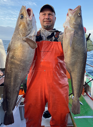 [ Shawn Rosenberger (NY), the king of doubles last season, is shown right holding an 7 pound pollock in his right hand and an 8 pound cod in his left, a typical double for him. He caught two of the top five biggest doubles of the Bunny Clark season last year. ]