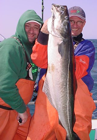 The picture on the right is a shot of me (right) holding the first slammer pollock of the 2004 Bunny Clark fishing season. It was a skinny 22 pounder. The bloke on the left in the good looking Bunny Clark hooded sweat shirt is none other than my all time groundfishing hero, Fred Kunz (NH). I always do better with Fred aboard! The scene took place on the May 13, 2004 marathon trip.