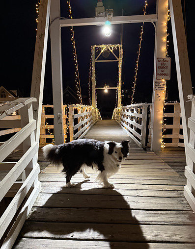 I took Gill for another walk after watching a bit of the Patriots game. I like to go after dark as there is usually no person on the Marginal Way. Actually, we only walked the southern, less slippery, portion of the Marginal, spending most of our 2.2 mile walk on the road or on the land between summer houses. We did walk through the Cove and over the Perkins Cove footbridge to continue walking over at the other side of the Cove and down shore road. There were no cars so it was a good night to walk there. Normally, it isn't. I never walk there with the dog in the summer, even with a leash. I took a picture of Gill on the footbridge. The Christmas lights are all still there. This digital image is below.