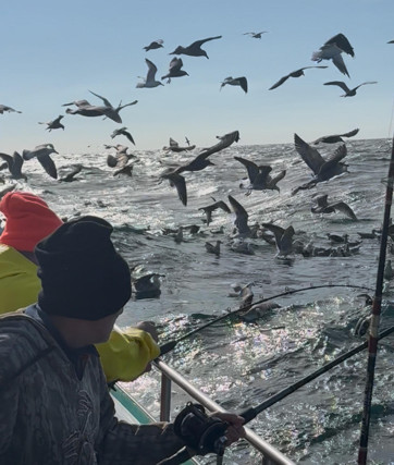 [The shot on the right is a digital image taken during the fishing as we were drifting along and seagulls attracted to the boat while in the process of catching. You can tell by the gulls that there were not many boats in the area where we were fishing.]