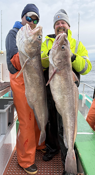 Tom Miller (NH) won the boat pool for the largest fish with the largest fish, a 32.5 pound Maine state trophy white hake. He also won the boat pool for the second largest fish with the second largest fish, a 30 pound Maine state trophy white hake. These two fish were caught as a double, both fish caught on the same line at the same time. This is the Bunny Clark's largest double of the 2025 fishing season and the largest double that has been caught on the Bunny Clark since Lewis Hazelwood (MA) landed a double that included a 40 pound Maine state trophy white hake and a 30.5 pound Maine state trophy white hake on July 9, 2019! Lewis' double might be the largest double that the Bunny Clark has ever seen. I took a picture of Tom and Danny D. holding Tom's two hake. This digital image appears on the left. Tom caught other fish today but nothing of note. He stopped fishing when it became too difficult to continue fishing on the bow. It's funny that I had my two best fishermen aboard today where I can say that I had an influence on their fishing abilities. But it was a guy under the tutelage of Phil Easteman (Eastman's Docks Fishing Fleet, Seabrook, NH) who got all the accolades.